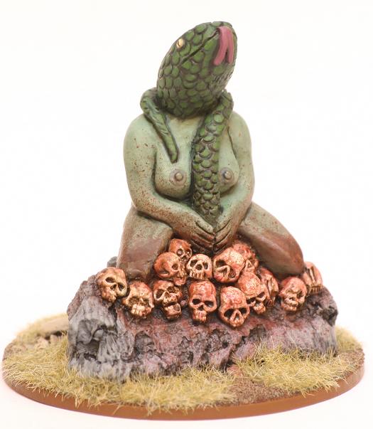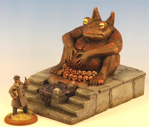 This is another idol from Monolith Designs. I bought it in Partizan a year ago. They were selling miscast pieces very cheap so I bought a lot of them for my Strange Aeons project. I have painted it as a big painted clay sculpture, I have used the resin defects to create chips where you can see the terracotta colour. You can see its size compared to an Uncle Mike’s Worldwide agent.